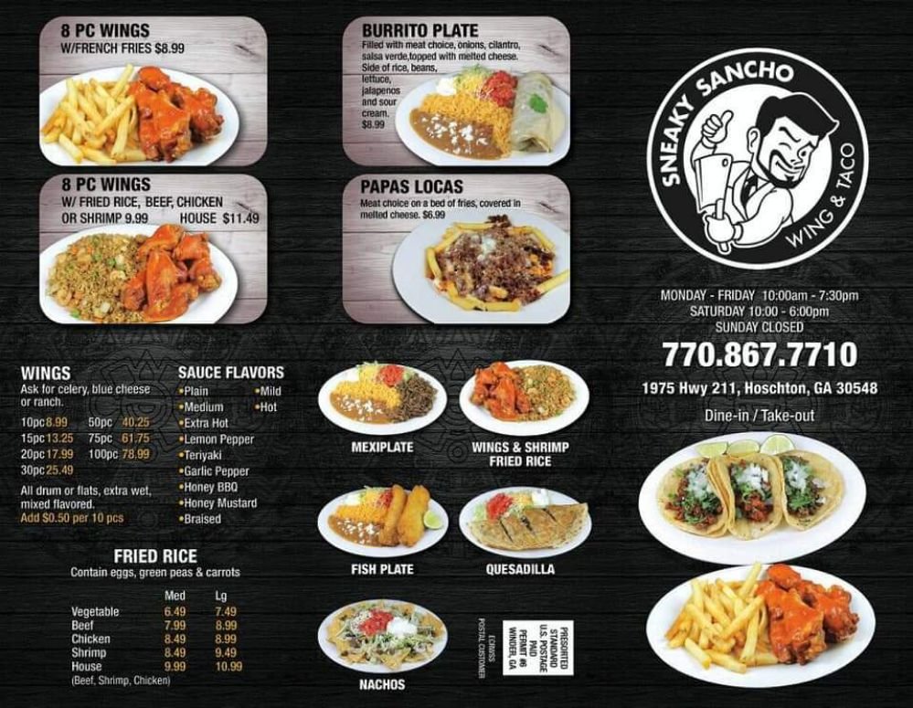 Welcome to Sneaky Sancho Wings And Tacos, where flavor meets fun in Hoschton, GA! This casual eatery specializes in mouthwatering Mexican chicken wings, offering something for every palate. Their menu boasts a variety of wing sizes, starting from a 5-piece serving at just $8.50, to larger platters perfect for gatherings.